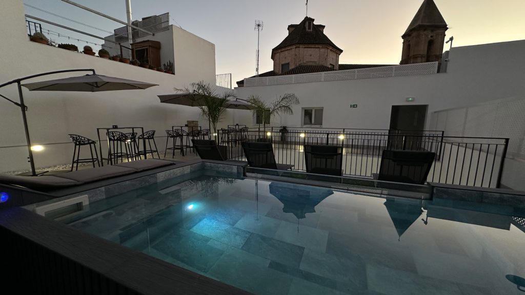 Pero lo que más nos llama la atención es su azotea con terraza y piscina, un rincón ideal para relajarse bajo el cielo azul de Jerez. Un lugar donde desconectar, tomar algo al sol y respirar ese aire andaluz que tanto engancha.