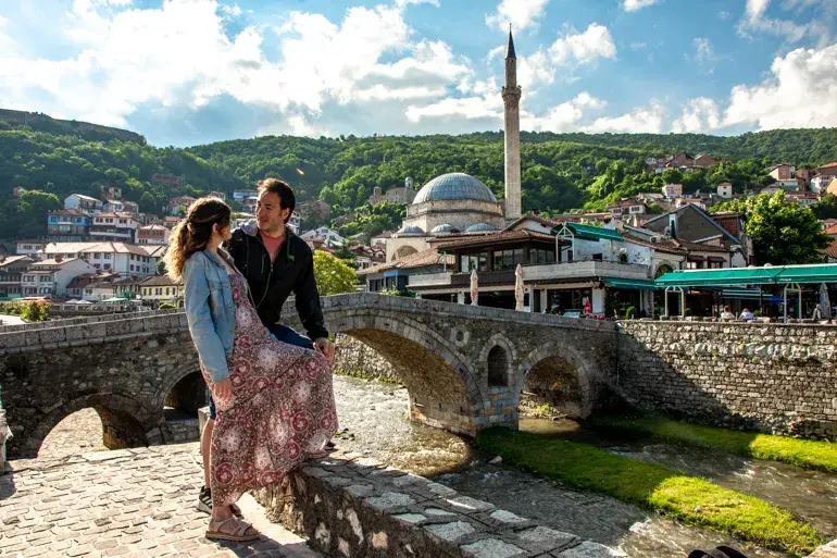 Rodeada de montañas y atravesada por el río Bistrica, Prizren sorprende desde el primer momento con una de las estampas más bonitas de los Balcanes. El Puente de Piedra, la mezquita junto al agua y la fortaleza vigilando desde las alturas forman un conjunto único. Sus casas antiguas, los adoquines desgastados y el aire entre otomano y balcánico lo convierten en un destino único.